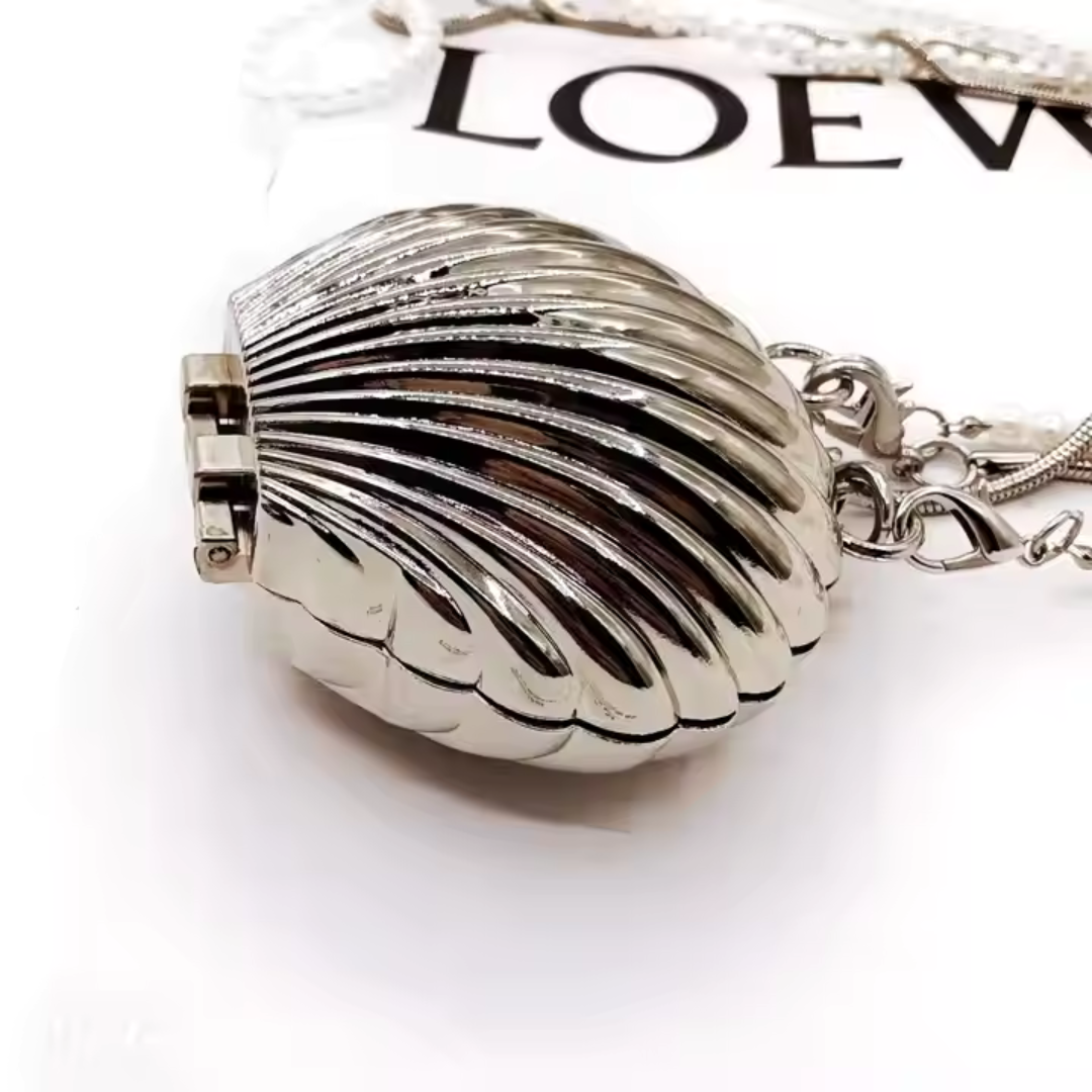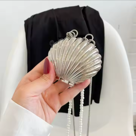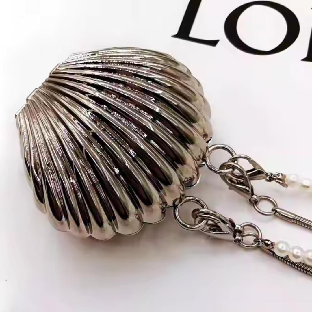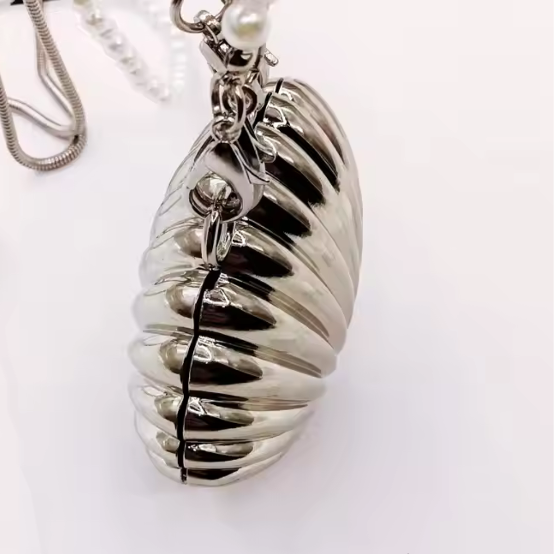 Make waves at any event with the Silver Conch Shell Evening Clutch. This 3D seashell-shaped acrylic bag features a glossy metallic finish and pearl chain handle, perfect for weddings, parties, or glam evenings out.