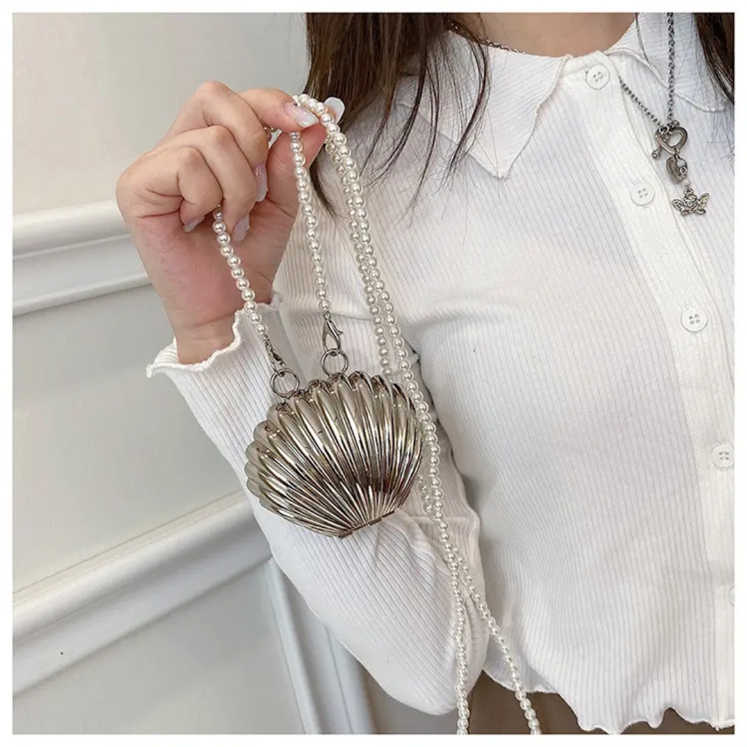 Silver Conch Shell Evening Clutch - Pearl Chain Wedding Purse